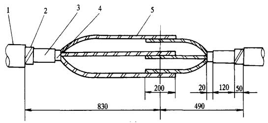 熱縮型電纜中間接頭分紙絕緣型和交聯(lián)型兩大類(lèi)型,前者適用于浸漬紙絕緣電纜,后者適用于塑料和交聯(lián)電纜。兩種類(lèi)型中間接頭在結(jié)構(gòu)上的主要區(qū)別在于,前者有隔油管而后者沒(méi)有,其結(jié)構(gòu)見(jiàn)圖3-109和圖3-110制作工藝簡(jiǎn)述如下。