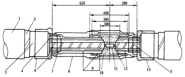 8—半導(dǎo)管;9—隔油絕緣管; 10—外絕緣管; 11—半導(dǎo)帶;12—四氟帶;13—填充膠帶